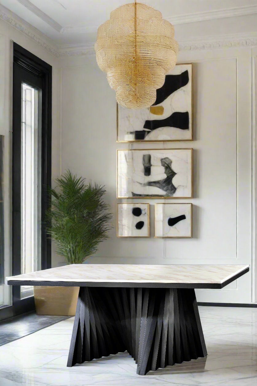 Sophisticated materials take a cue from modern geometry to create this spectacular rectangular dining table. Black color iron forms uniquely curved angles to balance a contrasting polished white marble top. A refined spin on trend-forward design and comfort create this amazing dining rectangular dining table.