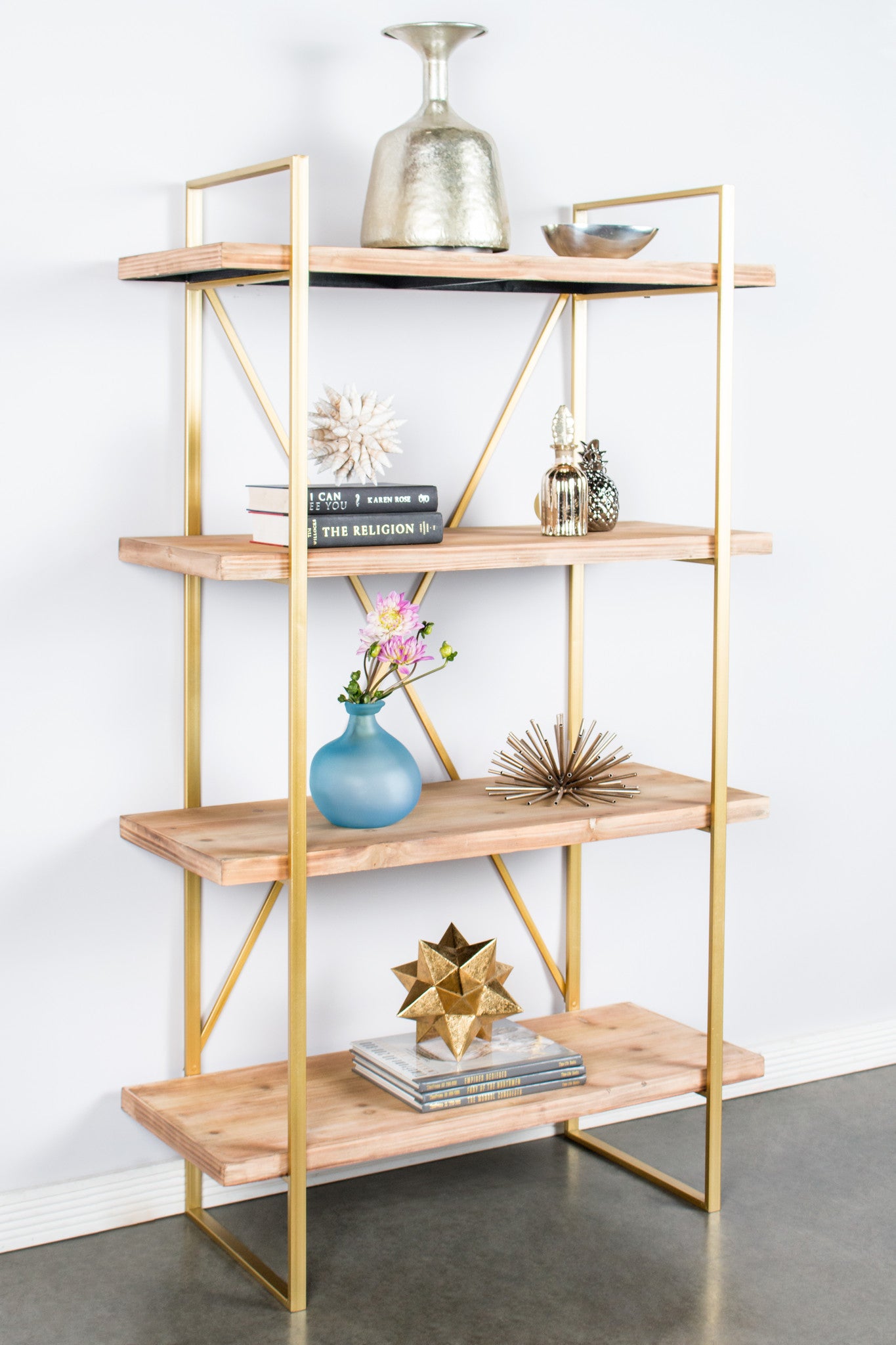 Showcase your collection of contemporary accents on the Emma Etagere. Featuring 4 wooden shelves on a gold-finished metal frame, the Emma provides you with ample space to display a group of tomes, bookends and statuettes. The rustic look of the natural wood and shiny gold details combine to create a truly unique piece.