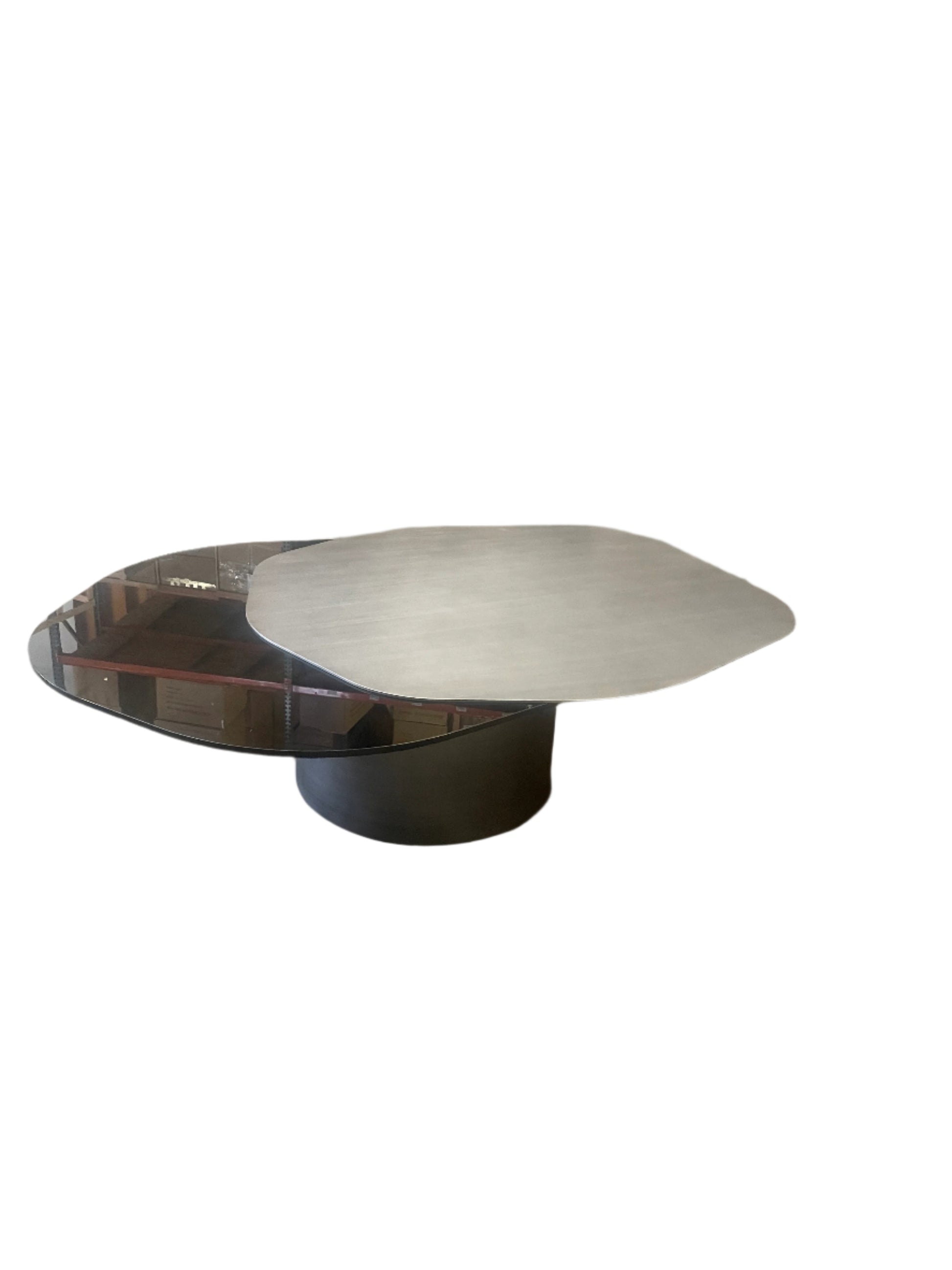 The Modern Irregular Kaylee Coffee Table is here to impress. Add a touch of luxury to your living space with this unique piece featuring a modern, sculptural design in matt silver and smoked black/gray glass. Elevate your decor and impress your guests with this one-of-a-kind coffee table.