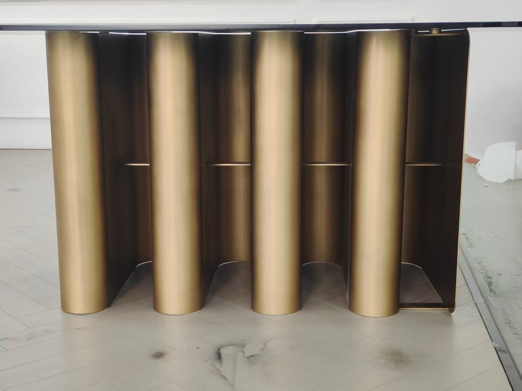 Gather the whole crew around this show-stopping dining table that seats eight in style. The sculptural wave brass base is pure architectural drama, while the smoked gray tempered glass top keeps things sophisticated and sleek. It's the kind of piece that makes dinner feel like an event. It sits 8 people.