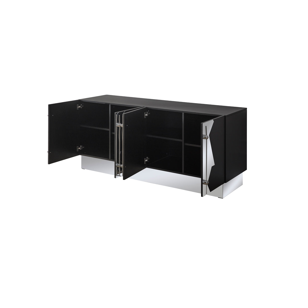 The Callista Sideboard features an Art deco-inspired design on the doors with a solid wood body and stainless-steel handles. The interior features one shelf in the middle. Whether it's used in the entry way, dining room or living room it will for sure be the focal point of your living space.4 doors sideboard. There are 4 cabinet spaces inside, each has a shelf in the middle.
